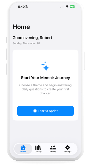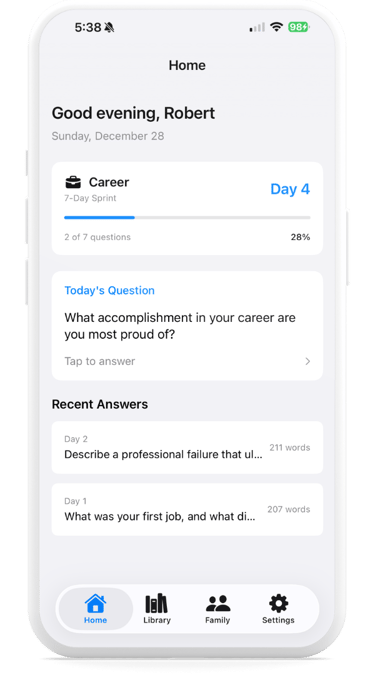 Digital Memoirs guides you through writing your memoir one question at a time. Each day, you'll receive a thoughtful prompt about your life—your childhood, career, relationships, adventures, and the moments that shaped who you are. Simply answer in your own words, and our AI transforms your responses into beautifully written memoir chapters.