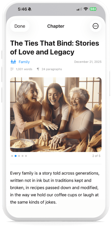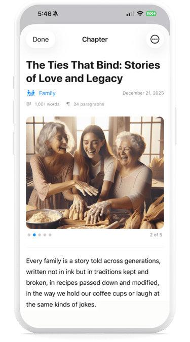 When you're ready, our AI transforms your answers into beautifully written memoir chapters. Review, edit, and make them yours.