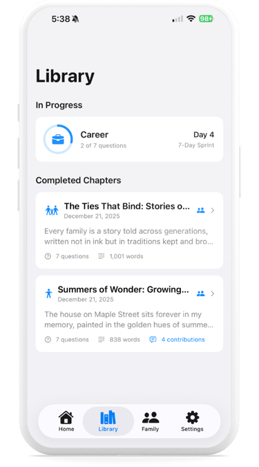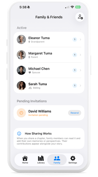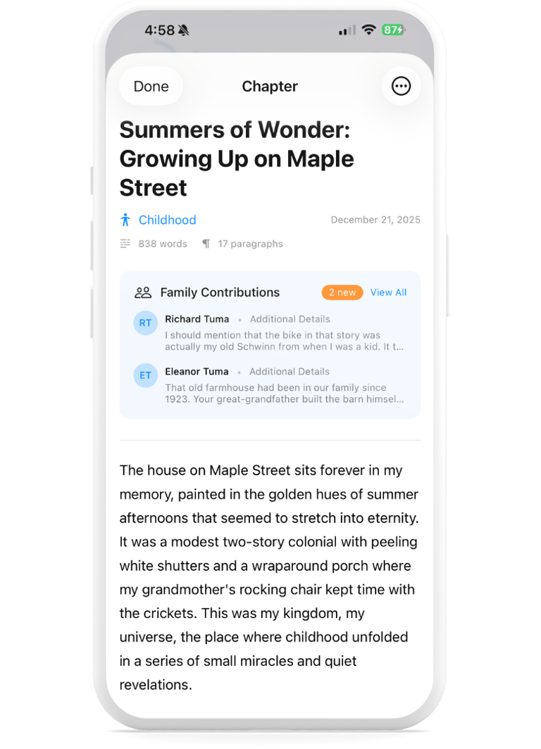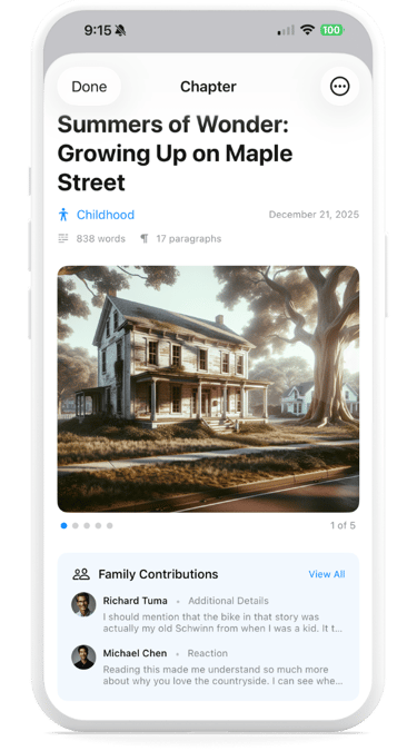 Invite family members to add their perspectives, memories, and photos. Your memoir becomes richer with every contribution.